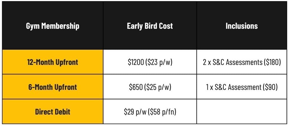 - Pay upfront for your membership and receive a FREE Strength & Conditioning Assessment with a tailored training program to help you reach your health and performance goals.