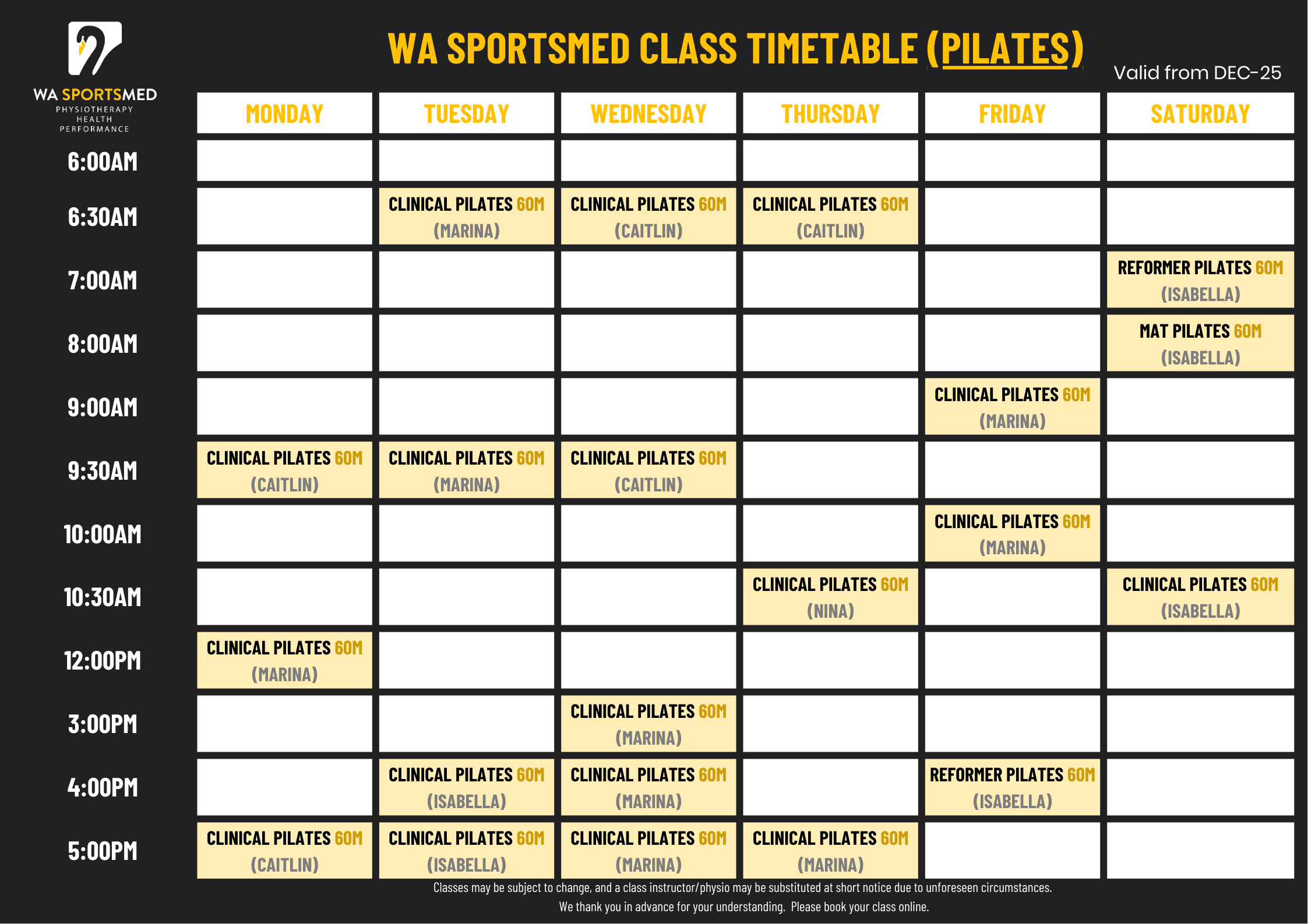 - If booking a 6x Class Pack, advance booking is required for all sessions in order to secure your preferred time